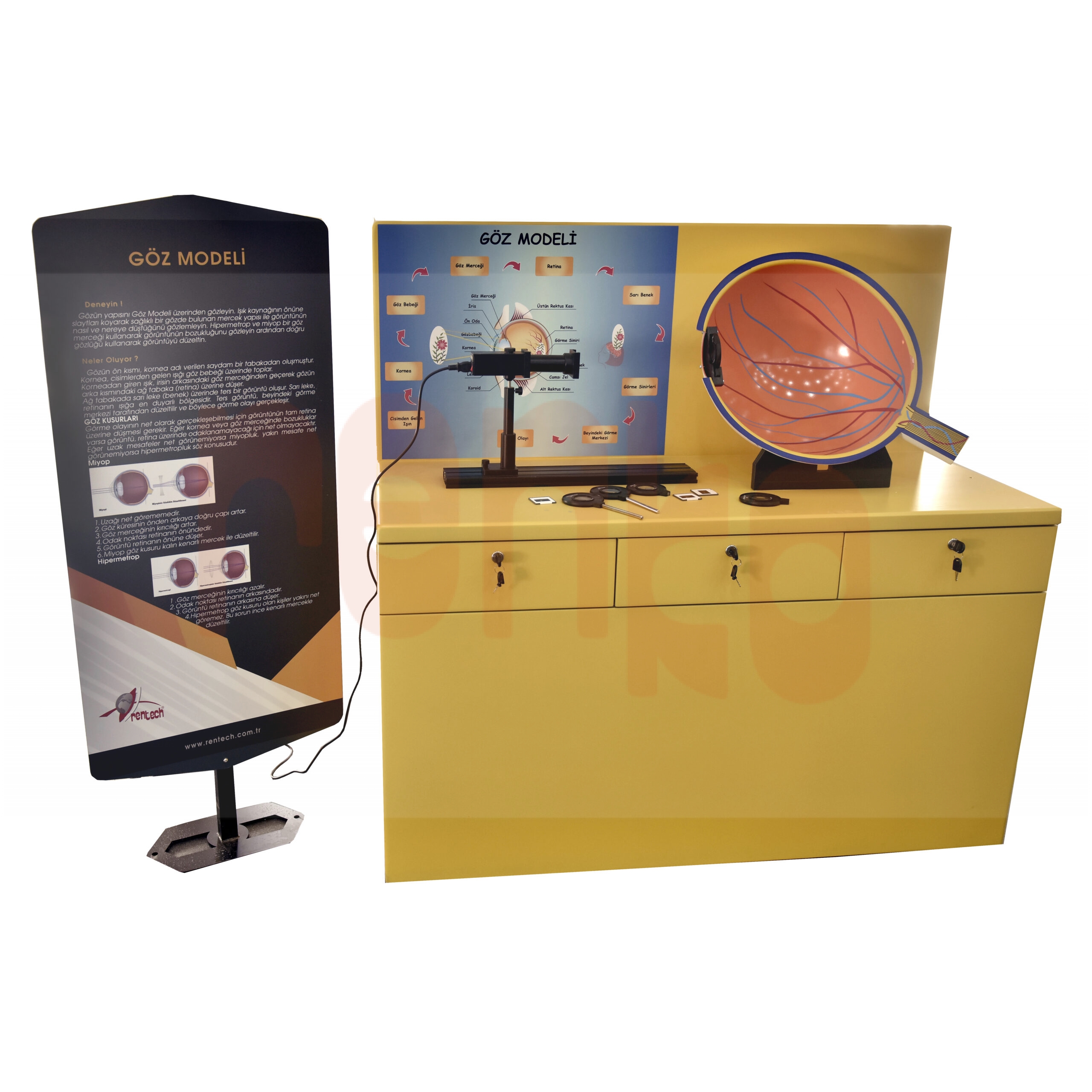Düzenek, Göz Modeli , optik ray, ince ve kalın kenarlı mercekler, mercek tutucular, ışık kaynağından oluşmaktadır. Mercekler ışık kaynağı ve perde, ray üzerinde yerleştirilerek objenin göz modelinde nereye düştüğü gözlenir. Sağlıklı göz merceği incelendikten sonra Miyop ve Hipermetrop mercekler kullanılarak bozukluklar gözlenir. Ardından Miyop ve Hipermetrop gözlük camları kullanılarak bozuk görüntünün nasıl düzeltildiği gözlenir.