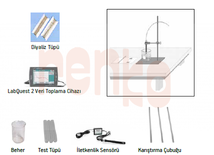 Yarı geçirgen diyaliz tüpleri değişik konsantrasyonlarda şeker içeren çözeltiler ile doldurulur, tüpler misina ile bağlanır ve difüzyon beher içinde gerçekleşir. İyon değişimi iletkenlik sensörü ile ölçülür. LabQuest 2 Veri Toplama Cihazı’nda veriler toplanır ve analiz edilir.