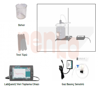 Gaz Basınç Sensörü, LabQuest 2 Veri Toplama Cihazı’na bağlanır. Şeker maya içinde fermantasyon olur. Veriler LabQuest 2 Veri Toplama Cihazı‘nda analiz edilir. Deney, test tüpünde gerçekleşir. Tripod, deney düzeneğine destek sağlamak amaçlı kullanılır.