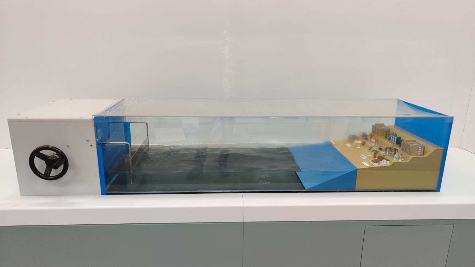 Bu düzenek, kolu çevirerek yapay bir tsunami yaratabileceğiniz, bu tsunami dalgalarının nasıl ilerlediğini ve şehir maketi üzerindeki etkisini görebileceğiniz interaktif bir demodur. Bu ürün, tsunamilerin neden olduğu değişimleri ve doğal afetlere karşı yapıların nasıl daha dayanıklı hale getirilebileceği üzerine düşünmek için mükemmel bir fırsat yaratır.